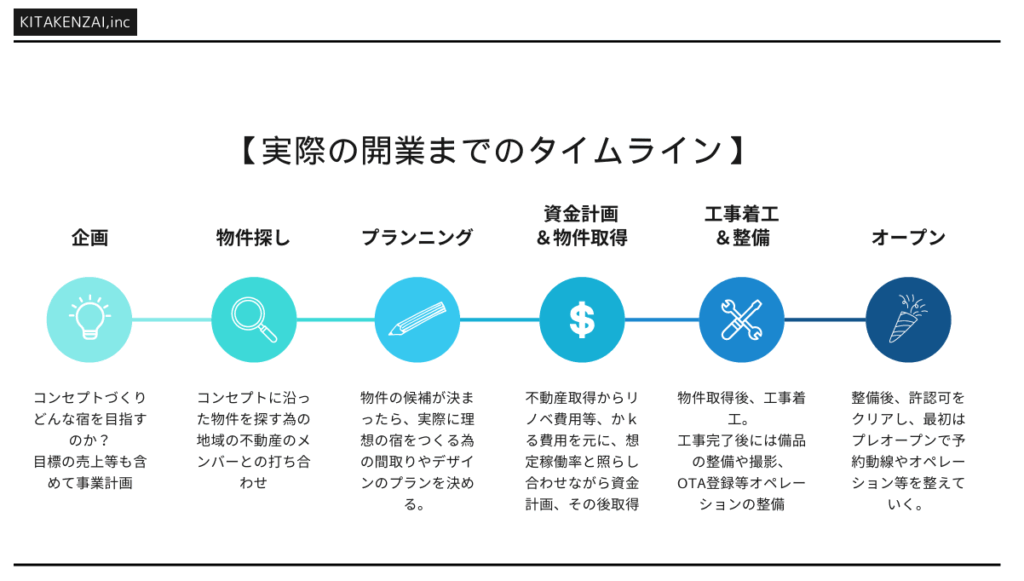 - 目的→コンセプト→物件選定→資金計画→許認可→施工・備品→運用準備→販売の一連を逆算で設計。